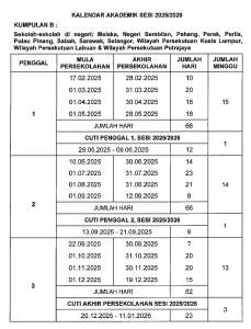 - Cuti Akhir Tahun: 20 Disember 2025 – 11 Januari 2026