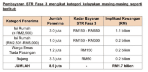 Jumlah bayaran yang diterima bagi STR Fasa 3 adalah bergantung kepada kategori kelayakan setiap penerima. Berikut adalah jadual pembayaran berdasarkan kategori:
